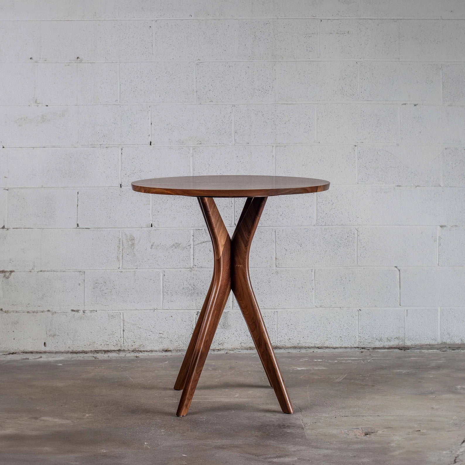 Design Sculptural crossed-leg base with four angled converging legs and round top